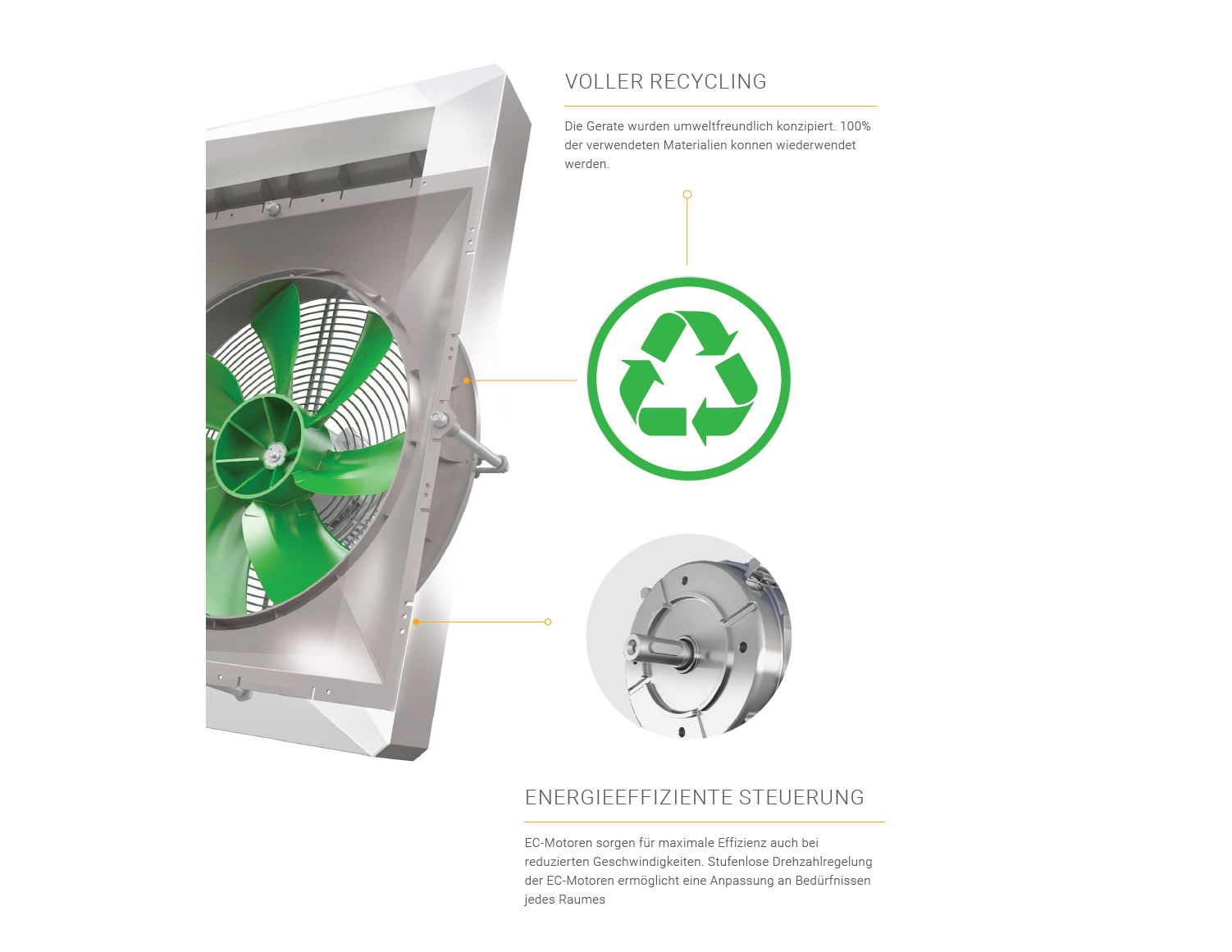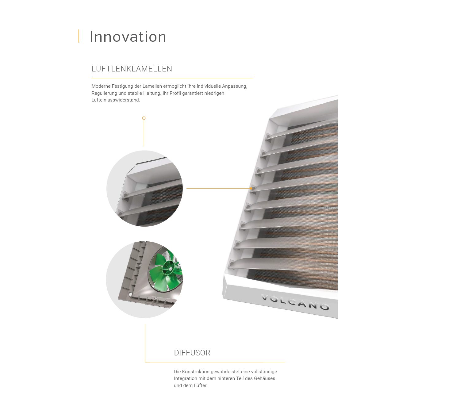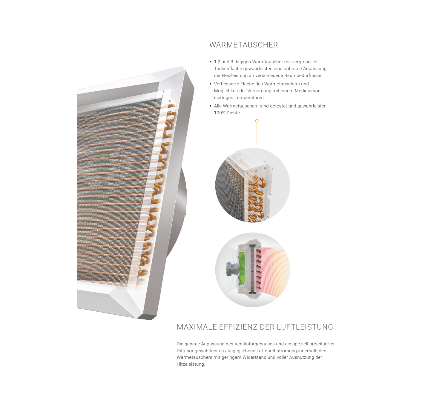 Die genaue Anpassung des Ventilatorgehäuses und ein speziell projektierter Diffusor gewährleisten ausgeglichene Luftdurchströmung innerhalb des Wärmetauschers mit geringem Widerstand und voller Ausnutzung der Hitzeleistung.